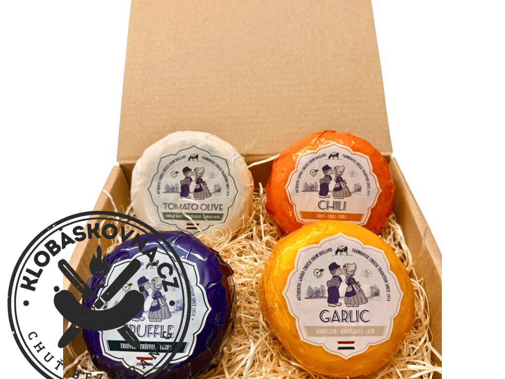 Dárkový box obsahuje výběr čtyř holandských sýrů typu gouda.