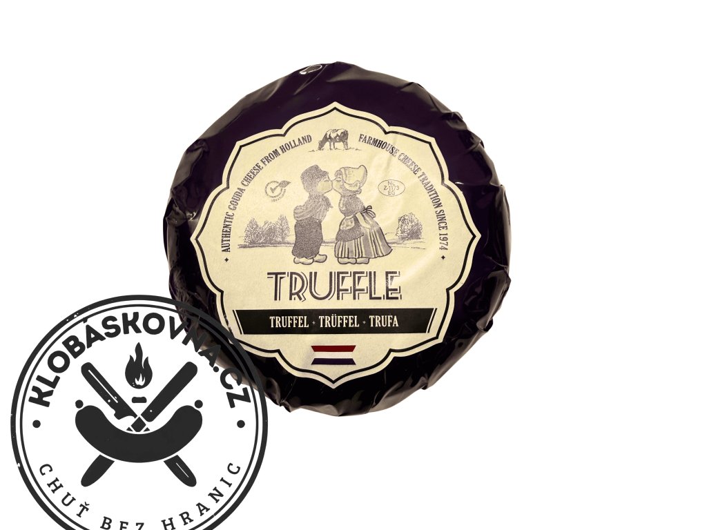 Baby Gouda Truffle 50+ – jemný holandský sýr s intenzivní vůní letní černé lanýže. Krémová textura, výrazná chuť a prémiová kvalita, ideální na prkénka, k vínu i do studené kuchyně.