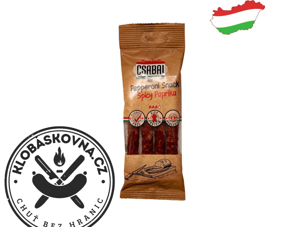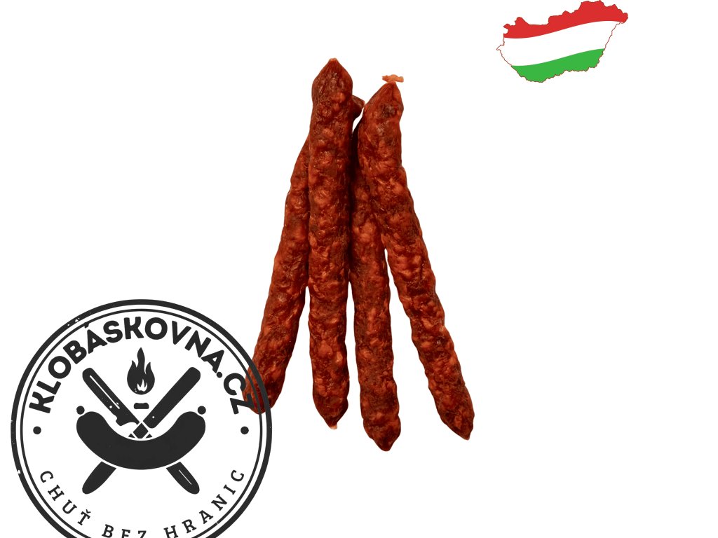 Pikantní verze oblíbené maďarské pochoutky. Tyto tenké klobásové tyčinky v sobě spojují chuť vepřového a hovězího masa s pořádnou dávkou chilli papriček. Jsou uzené na bukovém dřevě, krásně křupavé a ideální k zakousnutí, kdykoliv máte chuť na něco ostrého.