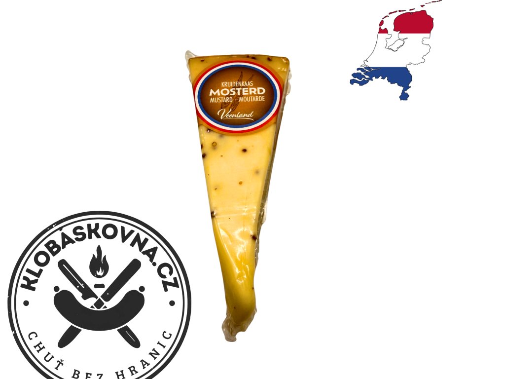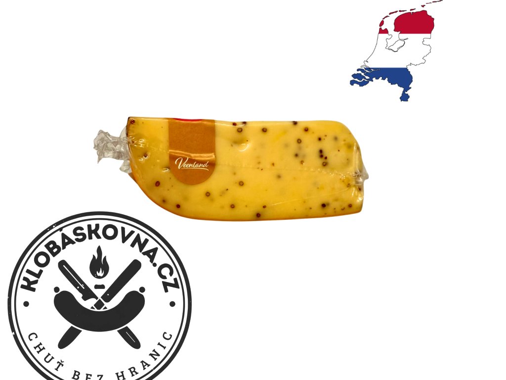 Sýr s hořčicí 48+ jemný holandský sýr z pasterizovaného kravského mléka s chutí hořčice. Skvělý do studené kuchyně, salátů, sendvičů i na sýrová prkénka.