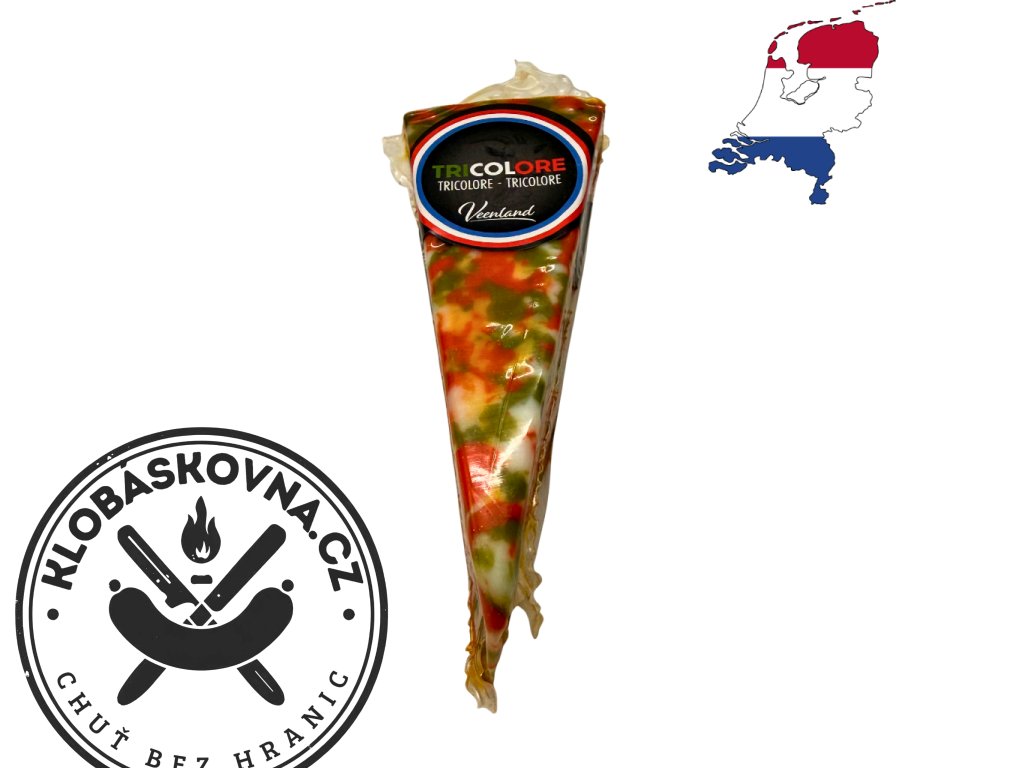 Tricolore 48+ je tradiční holandský sýr s výrazným tříbarevným vzhledem inspirovaným nizozemskou trikolórou. Vyrábí se z kombinace kravského a kozího mléka, díky čemuž má jemnou, lehce krémovou chuť s vyváženou mléčnou plností.