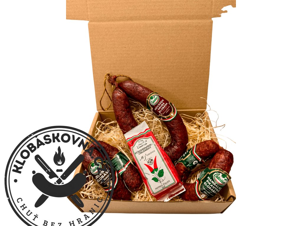 Balíček s výběrem poctivých klobás a pravé maďarské papriky. Ideální kombinace výrazné masové chuti, tradiční výroby a autentických středoevropských specialit.