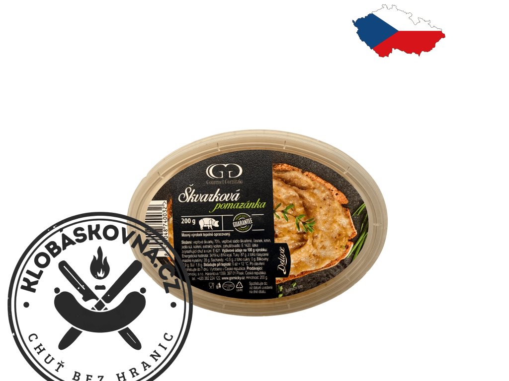 Složení: vepřové škvarky (70 %), vepřové sádlo škvařené, česnek, kmín, jedlá sůl, koření, extrakty koření, zahušťovadlo E1420 a látka zvýrazňující chuť a vůni E621.