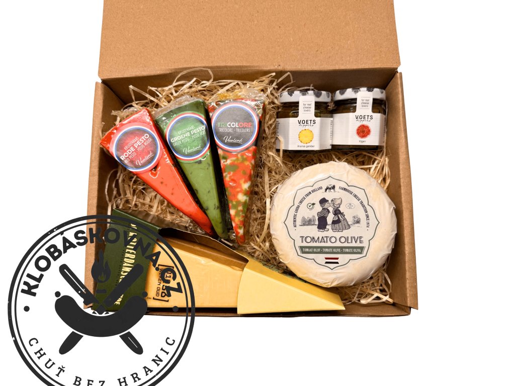 Pečlivě sestavený gurmánský sýrový box s výběrem holandských sýrů s rajčaty a olivami, pestem i klasickou vyzrálou goudou, doplněný o fíkový a ananasový dip. Ideální jako dárek nebo stylové pohoštění.